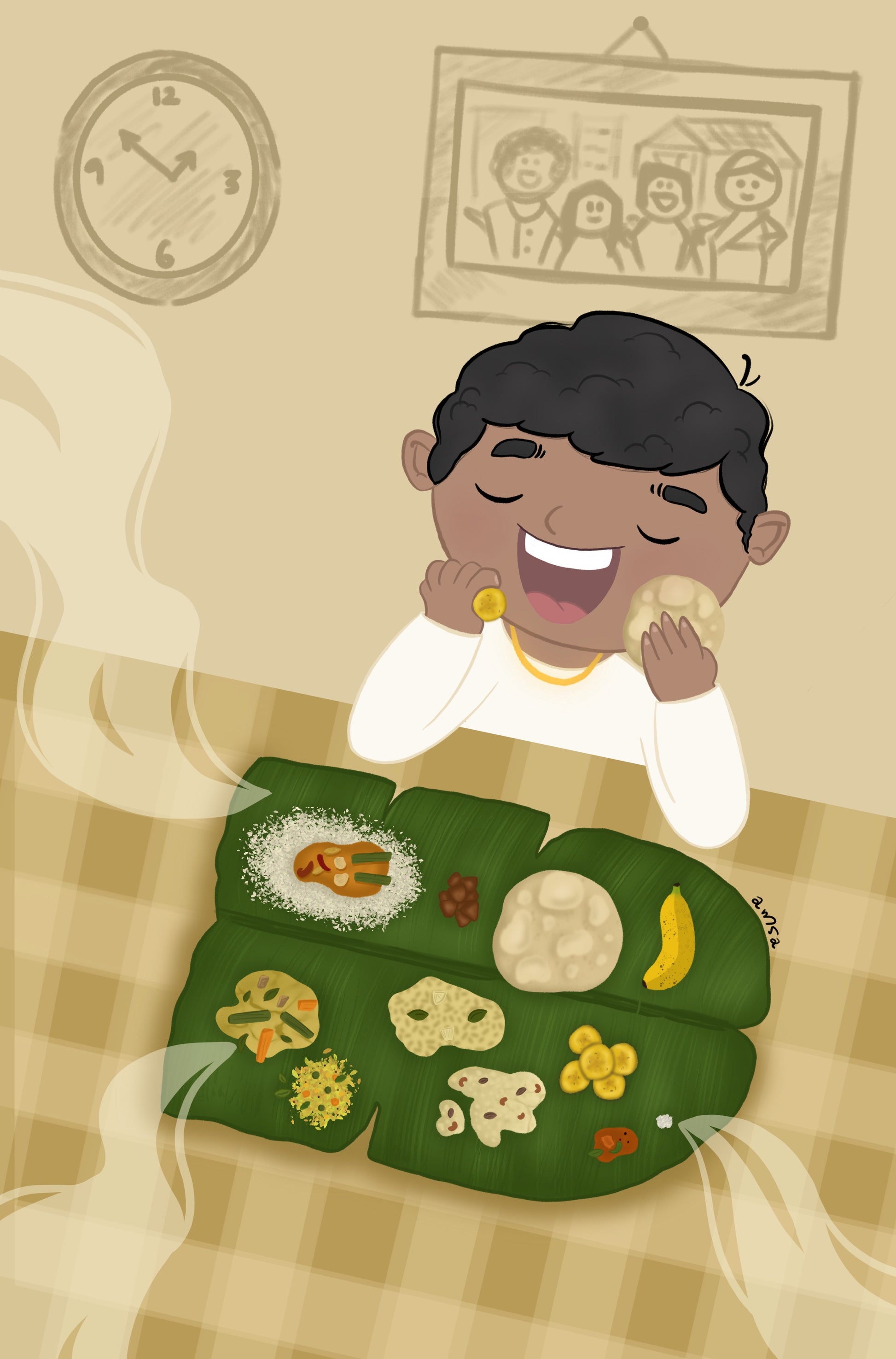 This illustration captures the pure joy of savouring a wholesome Sadya on Onam day. With rich details and lovingly depicted elements on the banana leaf, it brings alive the comfort, nostalgia, and happiness of a meal that’s meant to be enjoyed slowly. Just looking at it is enough to make you crave a good Sadya and smile at the simple pleasure of eating well.