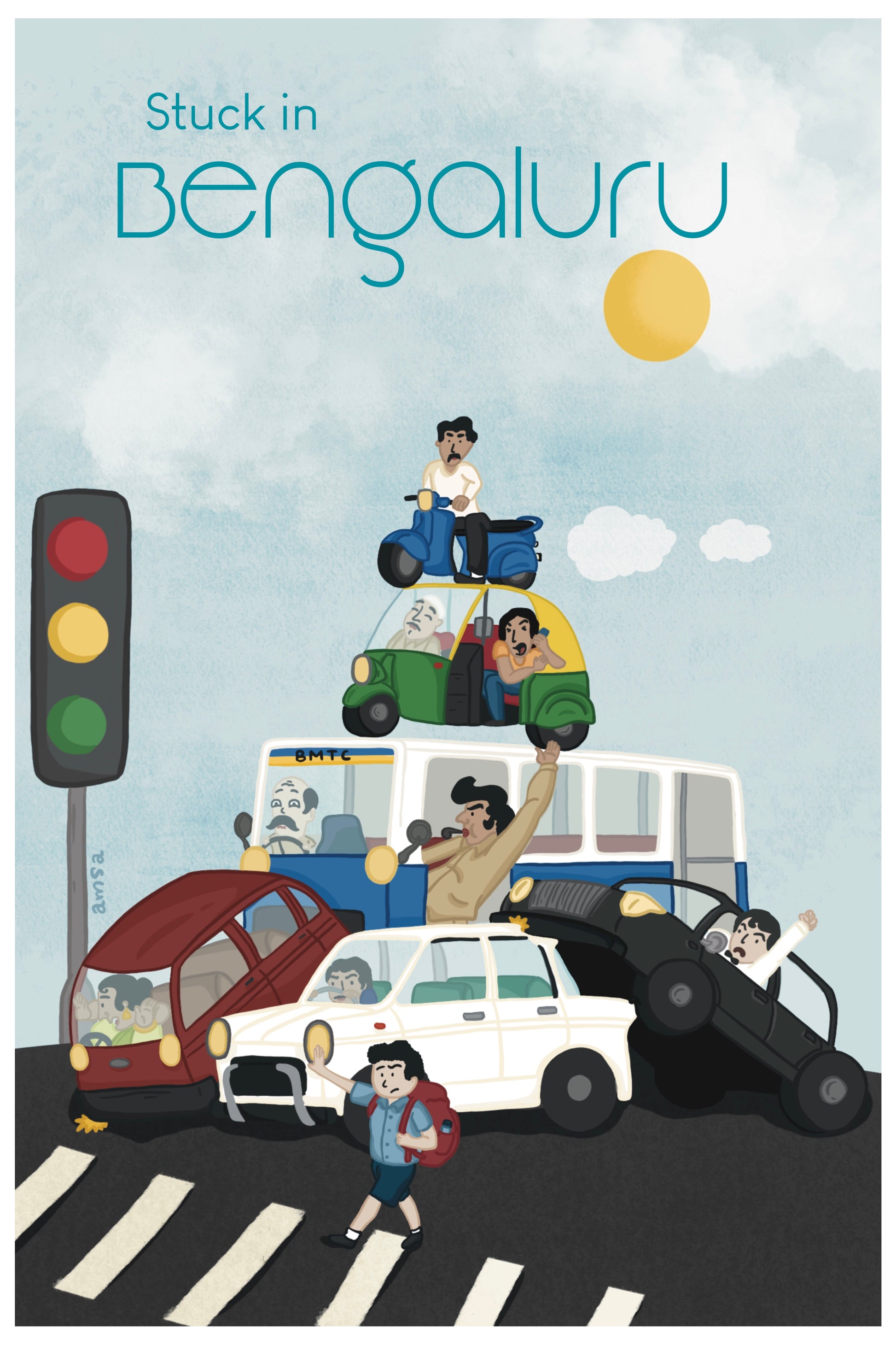 If you’ve ever said “I’m just 5 minutes away” and reached an hour later, this one’s for you. This artwork perfectly captures Bengaluru’s most iconic experience: being stuck in traffic. Autos, buses, cars, bikes, pedestrians - all coexisting in beautiful, absolute chaos. It’s frustrating, it’s funny, and somehow… it’s home.
